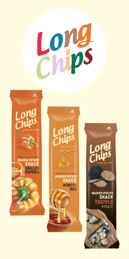 Long Chips maakt van chips een snack die direct opvalt. Niet rond, niet gekreukeld, maar lang, dun en extra krokant. De chips worden gemaakt op basis van aardappel en slechts 10 seconden gefrituurd in koolzaadolie. Daardoor krijgen ze hun lichte, knapperige bite en bevatten ze minder vet dan klassieke chips. Ook gebruikt Long Chips geen palmolie en geen kunstmatige additieven.